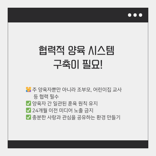 - 일관된 양육 원칙: 부모와 조부모, 어린이집 교사 간에 허용되는 것과 금지되는 것에 대한 기준을 맞춰야 합니다.