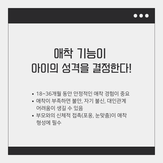 애착 기능은 18~36개월 사이에 집중적으로 형성되며, 이 시기에 안정적인 애착 경험이 부족하면 아이의 성격 형성에 부정적인 영향을 줄 수 있습니다. 불안정한 애착을 형성한 아이는 자기 불신, 불안, 사회적 관계의 어려움을 겪을 가능성이 높습니다.