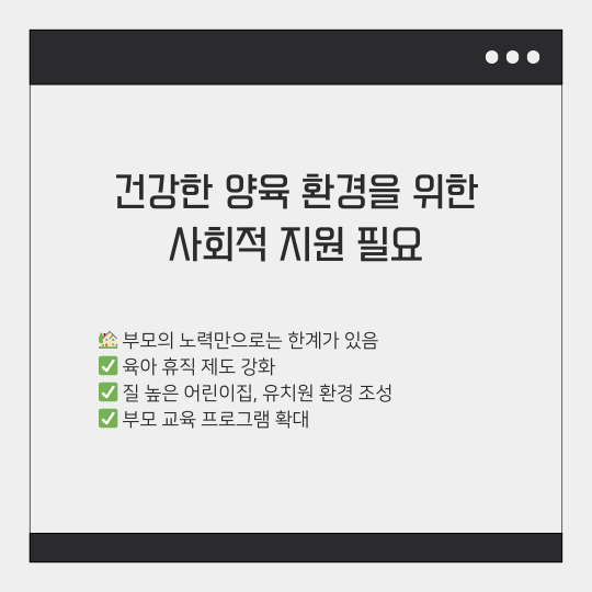 - 부모 교육 프로그램: 양육에 대한 올바른 지식과 정보를 제공하는 교육이 필요합니다.