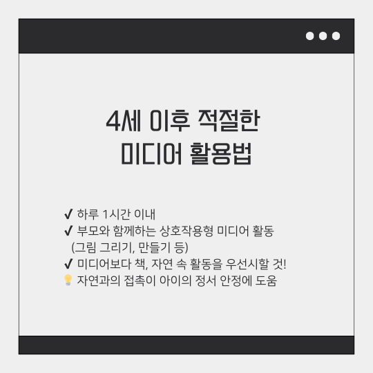 4세 이후부터는 하루 1시간 이내로 미디어를 활용할 수 있으며, 가능하면 부모와 함께하는 상호작용적인 미디어 활동을 권장합니다. 예를 들어, 가족이 함께 그림 그리기, 만들기, 교육용 영상 시청 등을 통해 미디어를 활용하면 긍정적인 영향을 줄 수 있습니다.