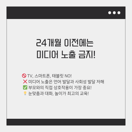 전문가들은 24개월 이전의 미디어 노출을 절대적으로 금지할 것을 권장합니다. 이는 아이의 눈맞춤 능력과 정서 인식 능력을 저하시켜 사회성 발달을 방해할 수 있기 때문입니다. 36개월까지는 실제적인 상호작용을 통한 발달이 매우 중요하며, 부모와의 직접적인 교감이 최우선이 되어야 합니다.