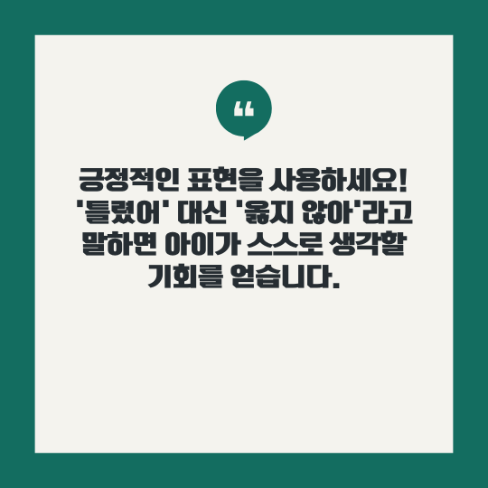 부모는 종종 무의식적으로 아이의 가능성을 제한하는 말을 하곤 합니다. "틀렸어"와 같은 표현은 아이가 실수에서 배우는 기회를 잃게 만들 수 있습니다. 대신 "옳지 않아"와 같이 표현하면 아이가 스스로 질문하고 생각할 기회를 얻게 됩니다.