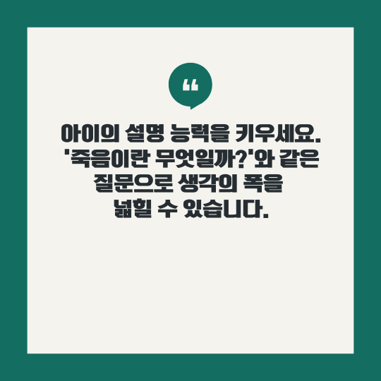 예를 들어, "죽음이란 무엇일까?"라는 질문을 통해 아이는 생명에 대한 새로운 시각을 가질 수 있습니다. 죽음을 단순히 생리적 현상으로 설명하는 대신, 좋아하는 일을 더 이상 하지 못하는 상태라고 설명하면 아이는 인생의 소중함을 깨닫게 됩니다.