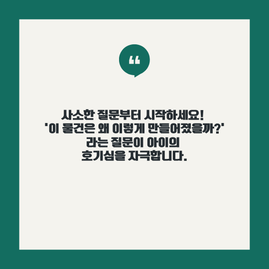 예를 들어, "이 물건은 왜 이렇게 만들어졌을까?"와 같은 질문은 아이가 일상에서 당연하게 여기던 것들을 새롭게 바라보게 합니다. 이러한 질문은 아이가 세상에 대한 호기심을 키우고 창의적인 사고를 발전시키는 계기가 됩니다.