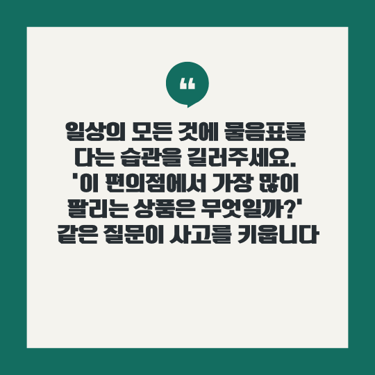 아이의 사고력을 확장시키기 위해서는 일상의 모든 것에 질문을 던지는 습관이 중요합니다. 예를 들어, 편의점에 갔을 때 "이곳에서 가장 많이 팔리는 상품은 무엇일까?"와 같은 질문은 아이가 사물을 분석하고 이해하는 능력을 키울 수 있습니다.